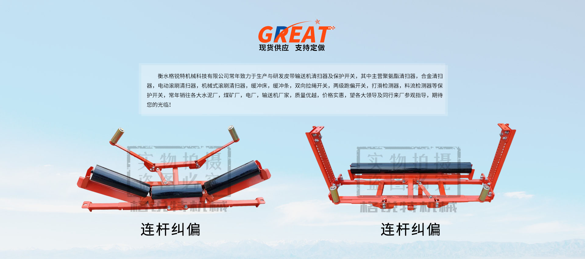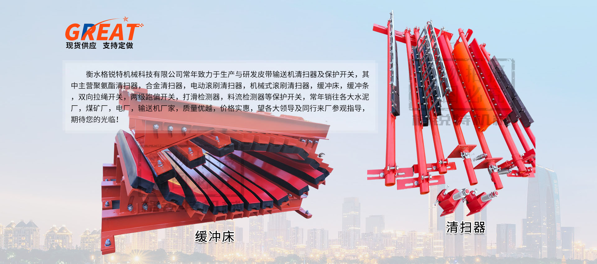 衡水格銳特機械科技有限公司常年致力于生產(chǎn)與研發(fā)皮帶輸送機清掃器及保護開關(guān),其中主營聚氨酯清掃器,合金清掃器,電動滾刷清掃器,機械式滾刷清掃器,緩沖床,緩沖條,雙向拉繩開關(guān),兩級跑偏開關(guān),打滑檢測器,料流檢測器等保護開關(guān),常年銷往各大水泥廠,煤礦廠,電廠,輸送機廠家,質(zhì)量優(yōu)越,價格實惠,望各大領(lǐng)導(dǎo)及同行來廠參觀指導(dǎo),期待您的光臨?。?!